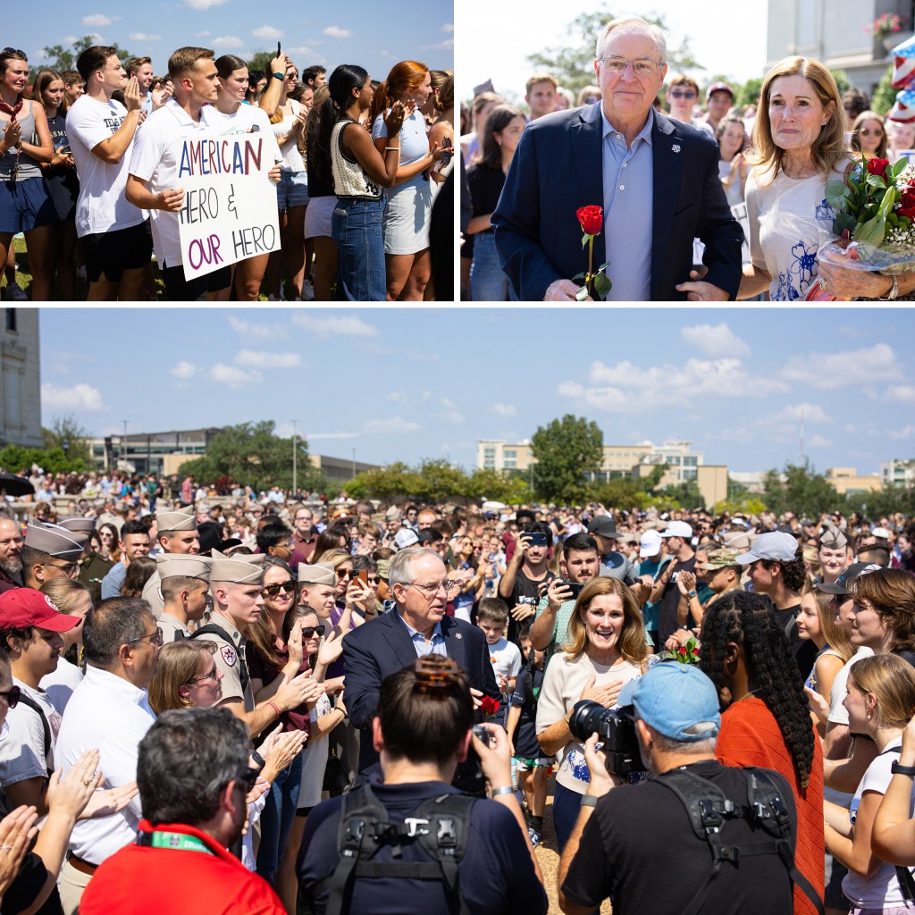 President Mark A. Welsh III and his wife Betty are greeted by A&M faculty, staff and students as he leaves campus after announcing his resignation on Sept. 19, 2025. Cassie Stricker for The Texas Tribune