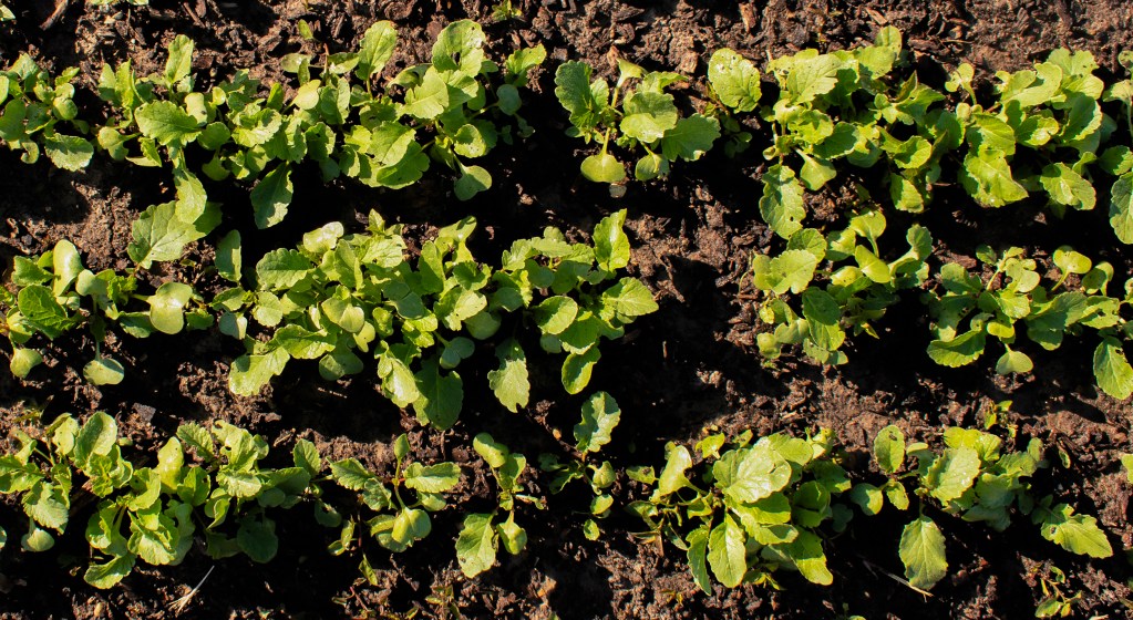 French breakfast radishes grow in rows at Opal’s Farm on the banks of the Trinity River in Fort Worth on Dec. 8, 2025. (McKinnon Rice | Fort Worth Report)