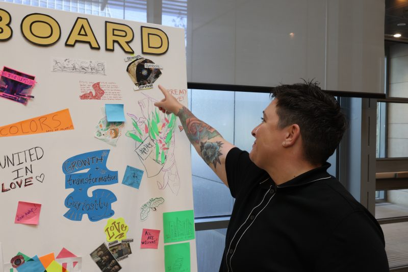 Fergie Fergus, one of the muralists involved in the Art for All project, shows a vision board at Austin Central Library. Isabel Neumann/Reporting Texas