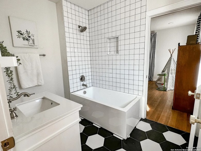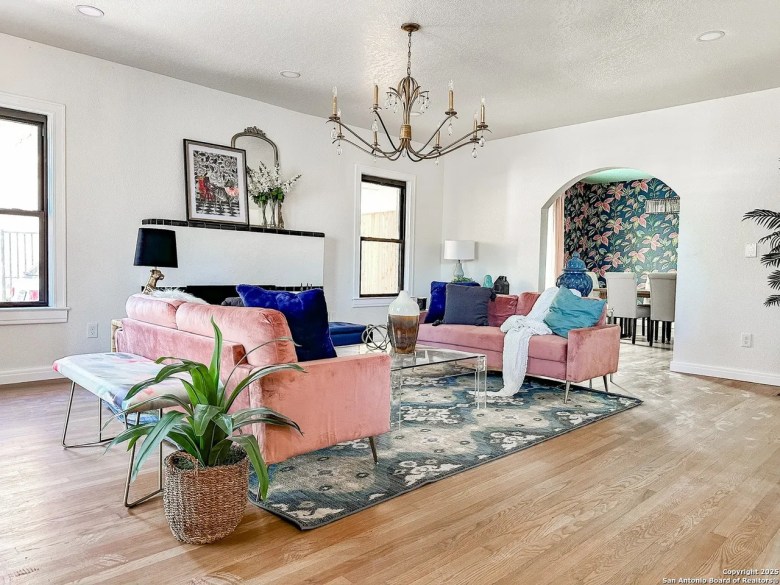 The front door with its round window looks straight out of a ’40s design book, and beautiful hardwood floors remain throughout the house. A tiled fireplace and arched doorways add old-school elegance to the living area.