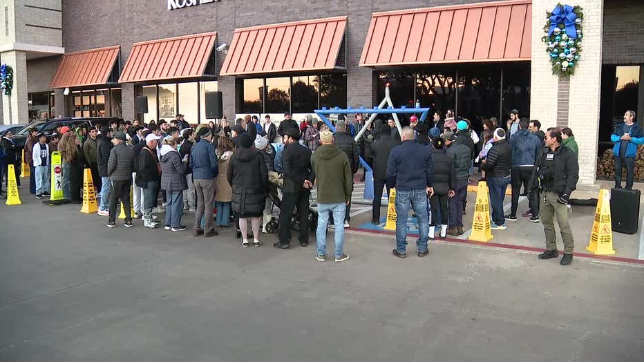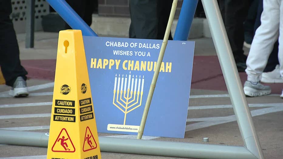 Worshippers gathered in North Dallas to light the first candle of Hanukkah, dancing and praying beneath a menorah as armed security stood guard.
