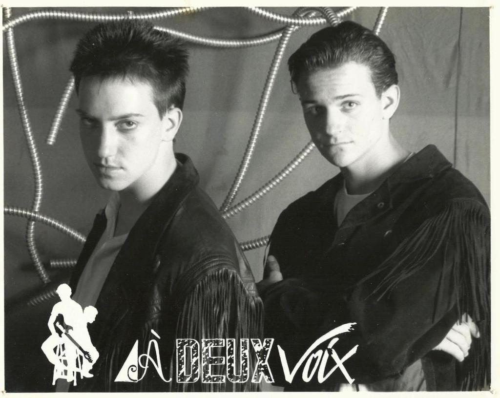 A candid moment of Richard McClure, right, performing with À Deux Voix, capturing the energy and style of their early days