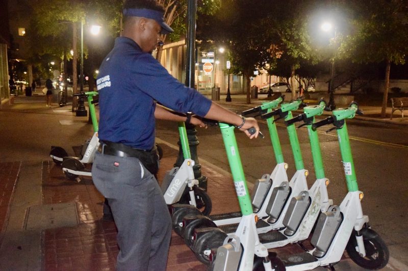 West Campus ambassador Anos Mensah returns scooters to their staging area and out of the way of pedestrians. SAMANTHA RUBIN/REPORTING TEXAS