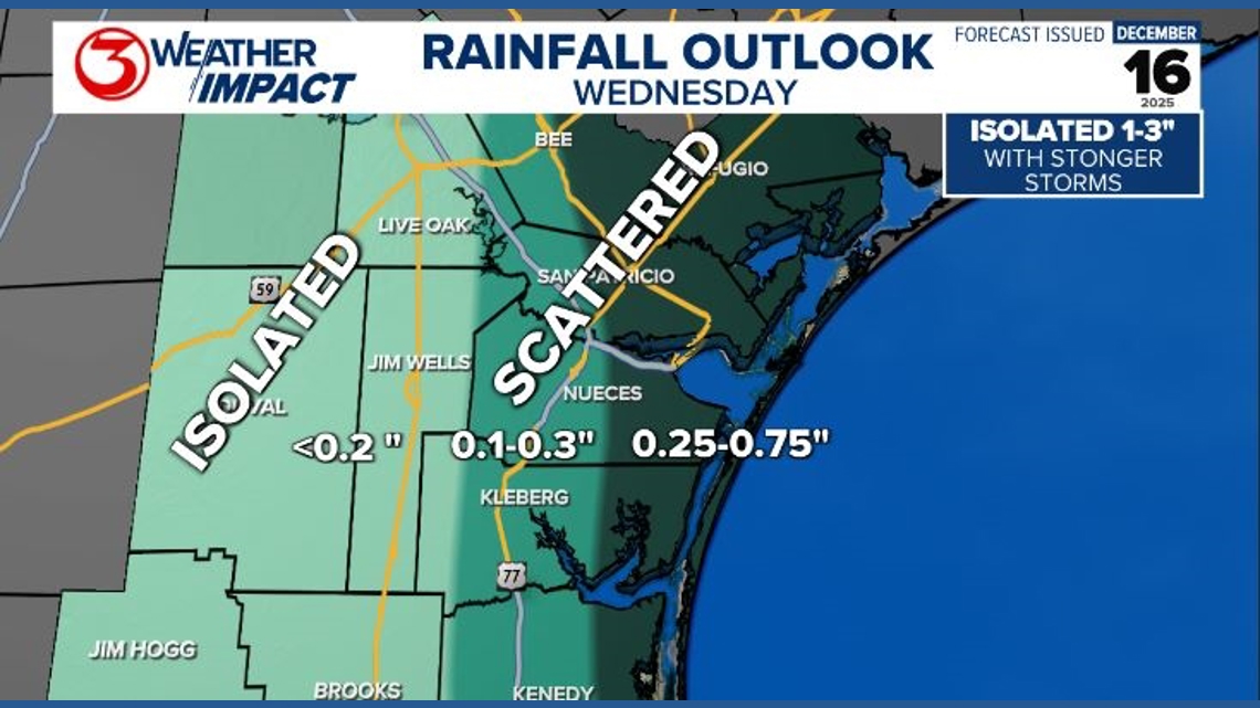 CORPUS CHRISTI, Texas — We are highlighting Wednesday morning and early afternoon for the chance of scattered showers and storms. Rainfall rates in some of these showers and storms could be up to multiple inches per hour, thanks to the high moisture content in our atmosphere. This may cause some localized street flooding and make it difficult to see while driving.