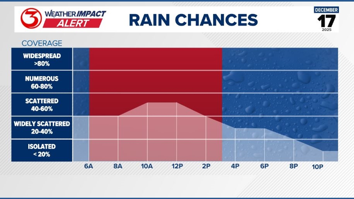 Scattered rain chances for showers and storms will keep roads wet throughout the day. Heavier pockets of rain could lead to ponding on roads.