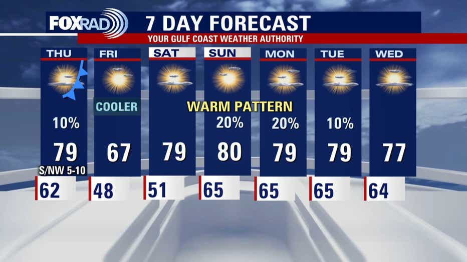 Aside from today’s rain, the overall pattern stays warm with only slight chances for drizzle. A weak front slips through late Thursday into Friday, briefly lowering temperatures and humidity. Friday morning will feel noticeably cooler, but the chill does not last long and no significant cold air is expected.