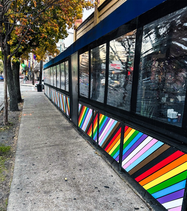 Today, the folks at Roy G’s, the restaurant located on the northwest corner of the intersection of Throckmorton Street and Cedar Springs Road, upped their rainbow game with a new, brightly-rainbow-colored facade wrapping around the street-facing sides of the building.