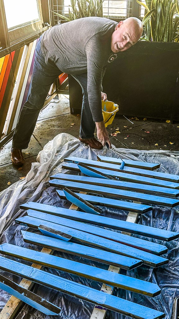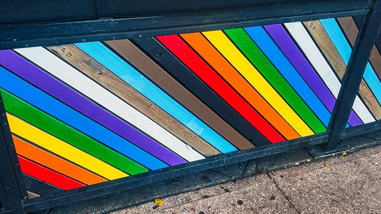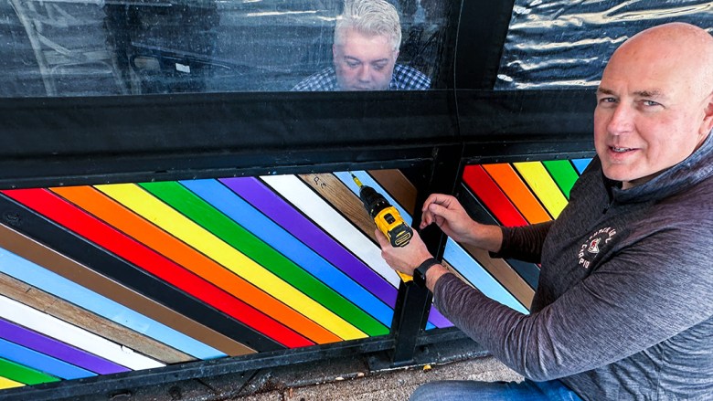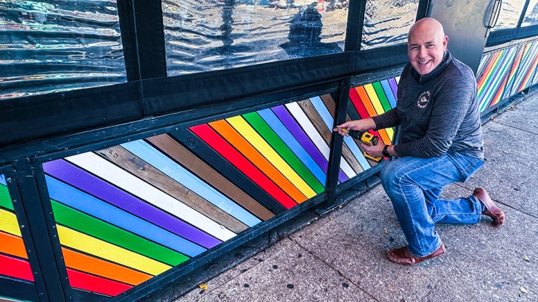 Unlike others on The Strip, the Roy G’s rainbows weren’t onto the building. Instead, the Roy G rainbows were created by painting individual strips of wood in the different colors of the Progress Pride flag — the rainbow flag that also includes the pink, blue and white of the trans Pride flag along with brown and black stripes to represent the true diversity of the LGBTQ+ community.