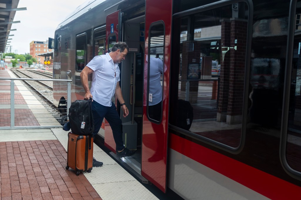 Panama City Beach, Florida, resident John Moore, 53, boards the TEXRail train on June 12, 2025, at the Fort Worth Central station. (Mary Abby Goss | Fort Worth Report)