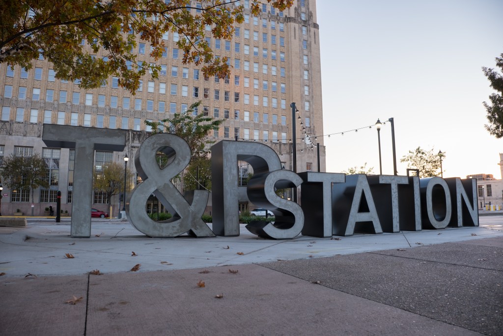 The T&P Station sign outside the downtown Fort Worth train station is pictured on Dec. 2, 2024. (Camilo Diaz | Fort Worth Report)