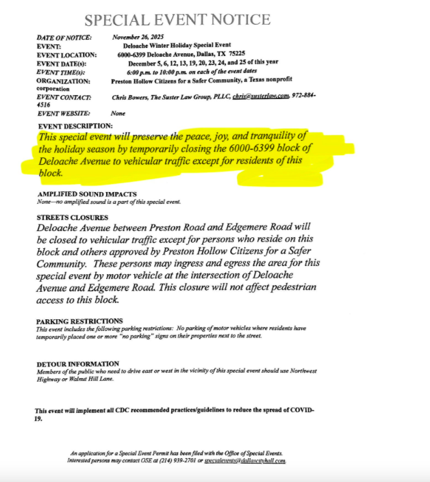 In a special announcement, the city said Preston Hollow Citizens for a Safer Community took out a permit to restrict vehicle and pedestrian traffic between Preston Road and Edgemere Road on weekend evenings this month.