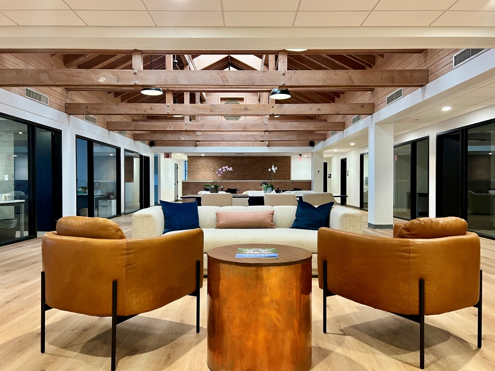The loft-like space centers on a dramatic main area with vaulted ceilings and timber trusses, flanked by glass-walled offices and breakout rooms. A residential-style kitchen supports quick meals and spontaneous conversations. Located above Le Bistrot Bar Sardine, the office is designed for meetings, networking, classes and events.