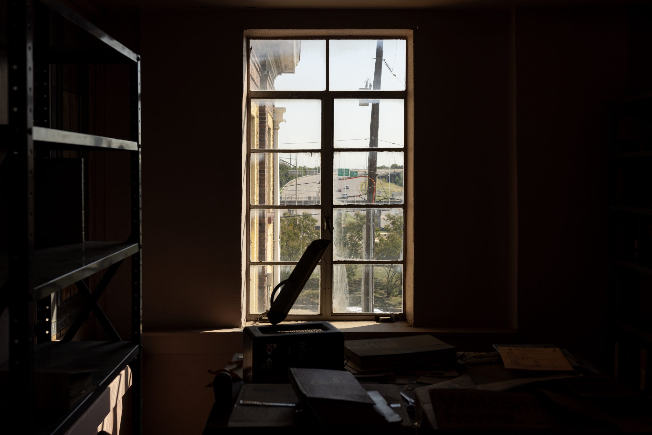 The highway is visible outside the window of Mount Gilead Baptist Church in downtown Fort Worth on Sept. 18, 2025. (Maria Crane | Fort Worth Report/CatchLight Local/Report for America)