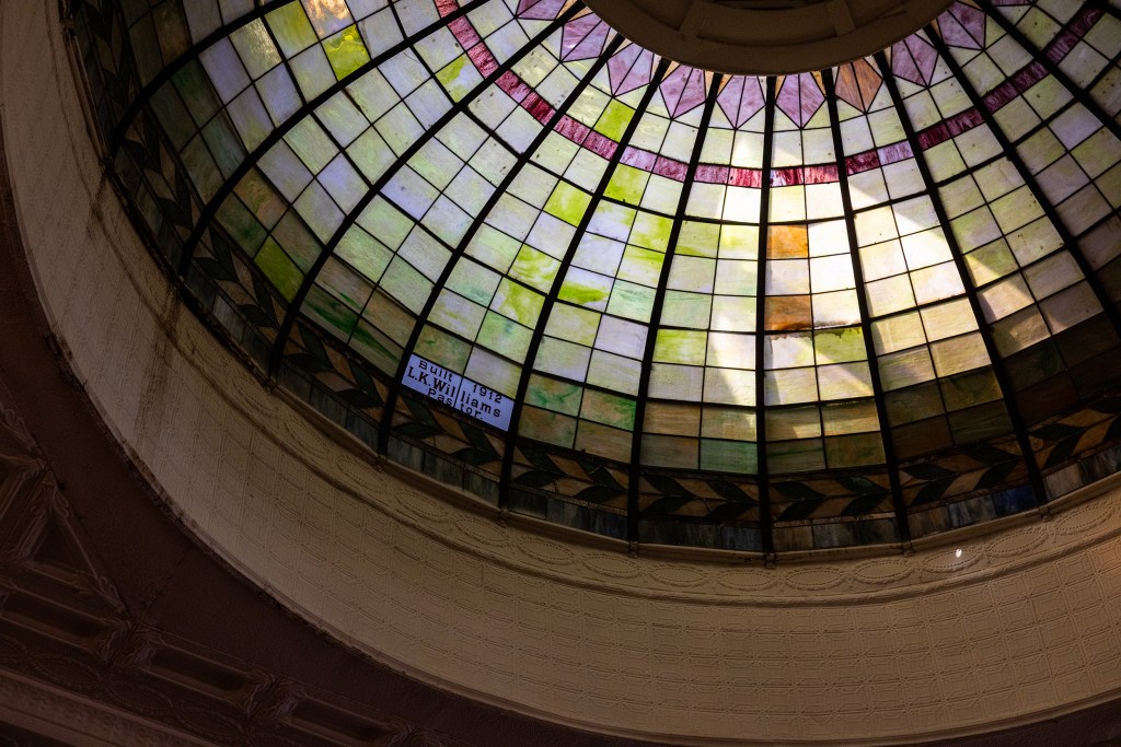 A stained glass dome resides above the pews of Mount Gilead Baptist Church on Sept. 28, 2025. This was installed by Pastor L.K. Williams when the church was first built. (Maria Crane | Fort Worth Report/CatchLight Local/Report for America)