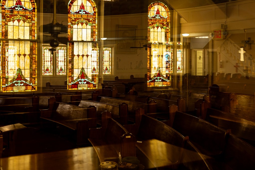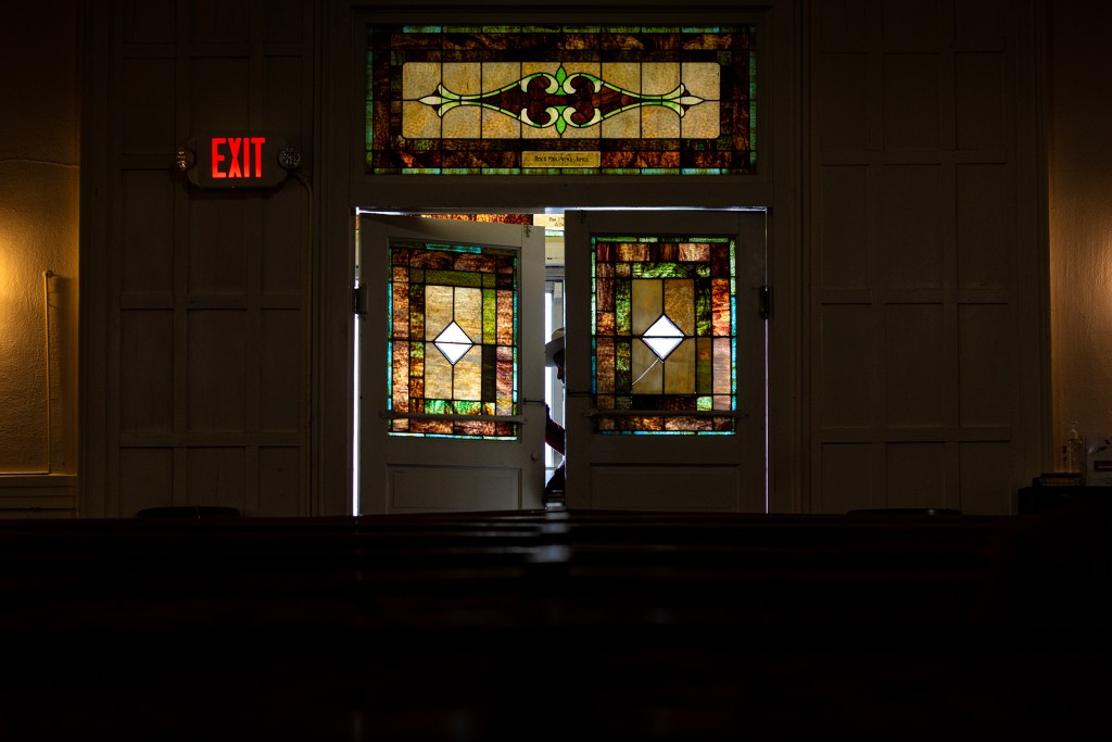 The white Tuscan columns that greet congregants outside the red brick church have shrugged off some of the color. Light peering through the stained glass windows inside the church illuminates the paint escaping the walls. Pale rings showing where moisture once resided bloom on the ceilings. The wooden stairs groan underfoot as congregants proceed up to the balcony or down to the basement.