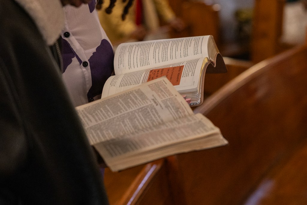 As Pastor Lorenzo Jones IV gives his sermon, members of the congregation follow along in personal Bibles and take notes on Dec. 21, 2025. (Maria Crane | Fort Worth Report/CatchLight Local/Report for America)