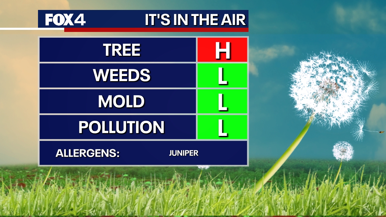 While it feels like spring, it also smells like it for allergy sufferers as tree pollen levels are currently high in North Texas, according to AccuWeather. Because pollen is fine and easily carried by the wind, experts recommend keeping windows and doors closed, especially during the early morning hours when counts are highest. Currently, ragweed and grass pollen levels remain low, while mold levels are moderate.