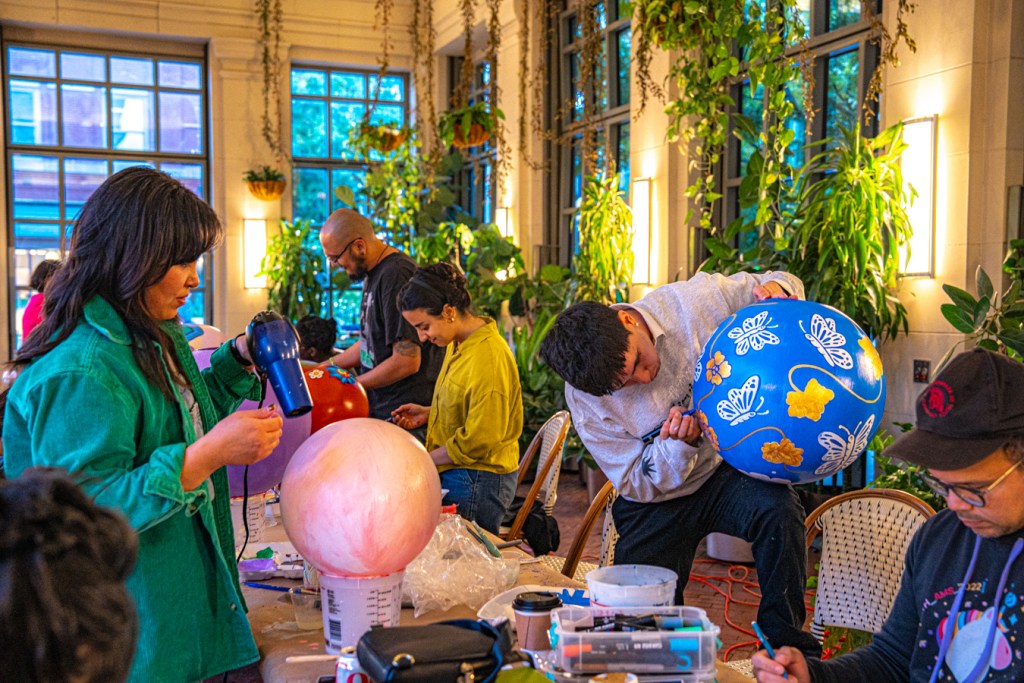 Fort Worth artist Erik Gomez, right, paints yellow flowers on his blue ornament as other local creatives worked on theirs in early November. (Courtesy photo | Daniel Kwaw)