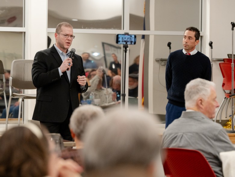 Councilman Marc Whyte (D10) listens as Miguel Vergara, Field Office Director at U.S. Immigration and Customs Enforcement, speaks at a District 10 community meeting on Monday evening. Credit: Brenda Bazán / San Antonio Report