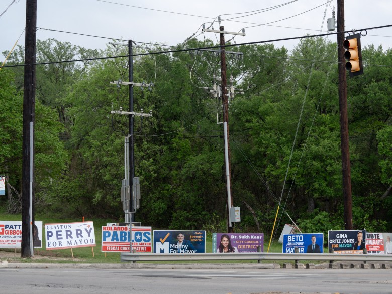 Campaign signs for candidates in the San Antonio mayoral race punctuate an intersection along Basse Road. Credit: Brenda Bazán / San Antonio Report