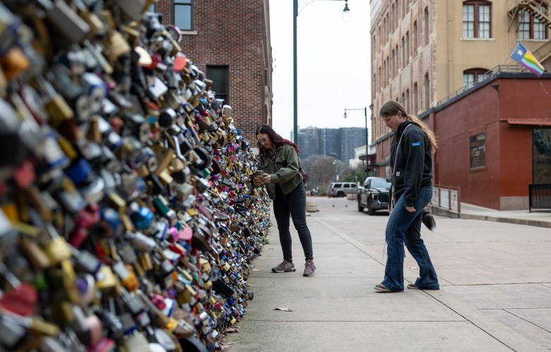 Tourists take photos of hundreds of locks on what’s called the love lock bridge Monday. Credit: Bria Woods / San Antonio Report