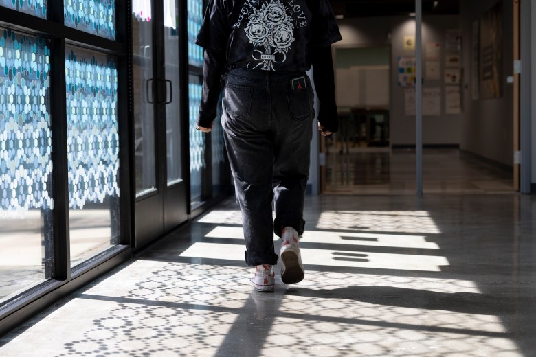 A student walks through a hallway inside of CAST Med High School. Hundreds of students experiencing homelessness across the San Antonio region have been suspended from school in recent years for minor infractions, likely in violation of a 2019 law. Credit: Bria Woods / San Antonio Report