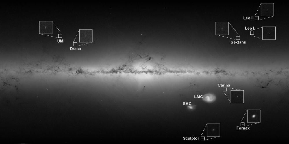 Some of the known satellite galaxies of the Milky Way, including the well-known Large and Small Magellanic Clouds. There could be many more of them according to simulations, and if scientists can find them, it supports the Lambda Cold Dark Matter model. Image Credit: ESA/Gaia/DPAC. CC BY-SA 3.0 IGO