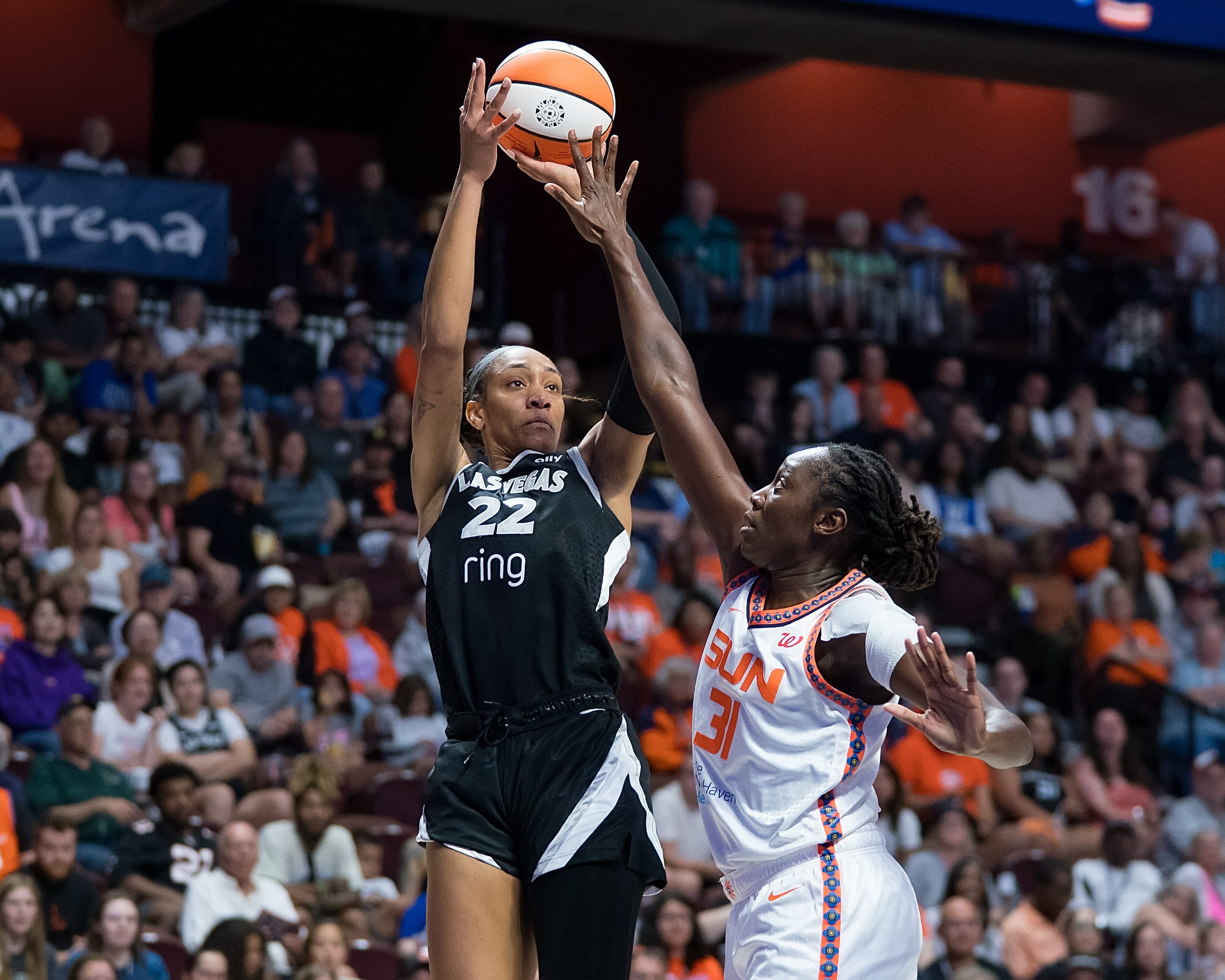 A’ja Wilson and the Aces are shooting for an 11th straight win in tonight’s visit to Chicago (Photo credit: Chris Poss)
