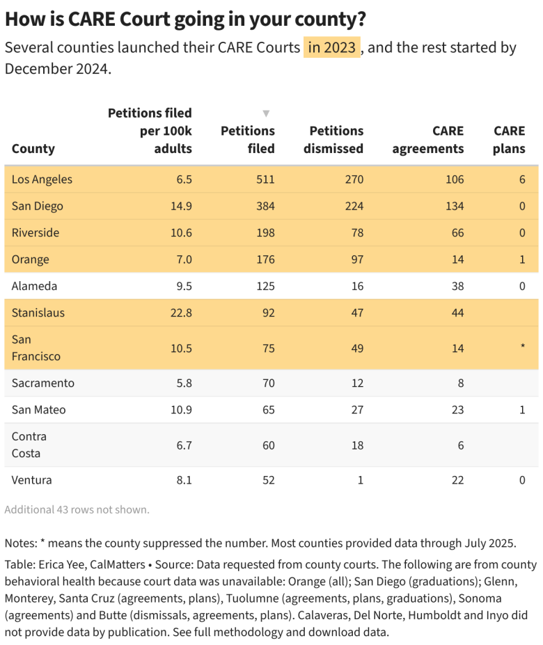 Orange County, which was part of the initial CARE Court cohort, expected to receive 1,400 petitions and establish between 400 and 600 treatment plans its first year. Two years later, it has received at least 176 petitions , reached 14 CARE agreements and ordered one CARE plan, according to the county’s behavioral health department. That doesn’t include additional petitions that could have been dismissed by the court before reaching the county.