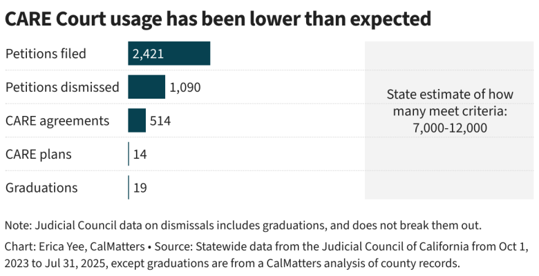 While Newsom’s administration estimated between 7,000 and 12,000 Californians would qualify for CARE Court, just 2,421 petitions have been filed through July, according to the Judicial Council of California. Only 528 of those have resulted in treatment agreements or plans.
