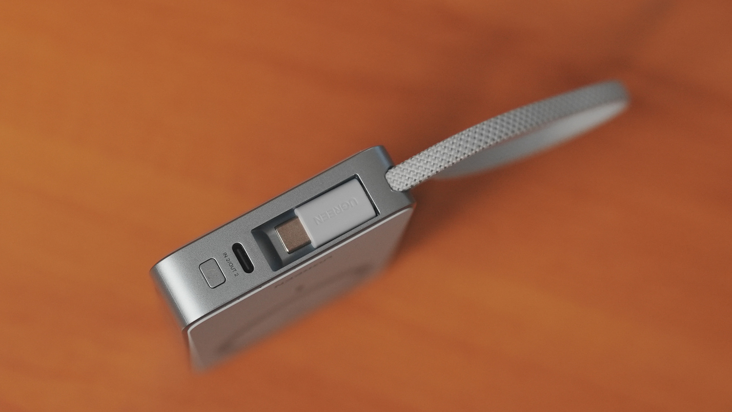 The UGREEN Magflow 10,000 mAh Qi 2.2 power bank comes in a compact, card-shaped form with the magnetic charging pad on one side and an additional port on one edge. It comes with a built-in woven flat USB-C cable capable of 30 W charging, which retracts into a hand strap when the tip latches onto the compartment. The USB-C port beside it is also capable of 30 W charging when paired with a compatible cable. This model, however, does not have any USB-A ports, which may be a downside for those who still use USB-A cables on low-power devices.