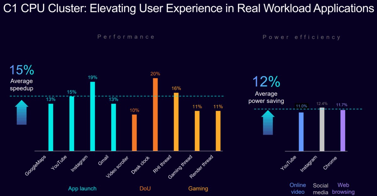 For real-world use cases, the Arm C1 CPU cluster shines, with an average 30 percent performance uplift across industry-leading performance benchmarks and an average 15 percent speed-up across applications like gaming and video streaming compared to the previous generation CPU cluster under the same conditions. These performance improvements come alongside power savings, with an average 12 percent less power used across daily mobile workloads, like video playback, social media, and web browsing, compared to the previous generation CPU cluster under the same conditions.