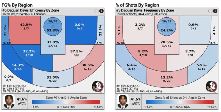 Like many young guards adjusting to the speed of high major basketball, Davis did not shoot the ball efficiently at FSU, as his numbers and shot charts reflect: