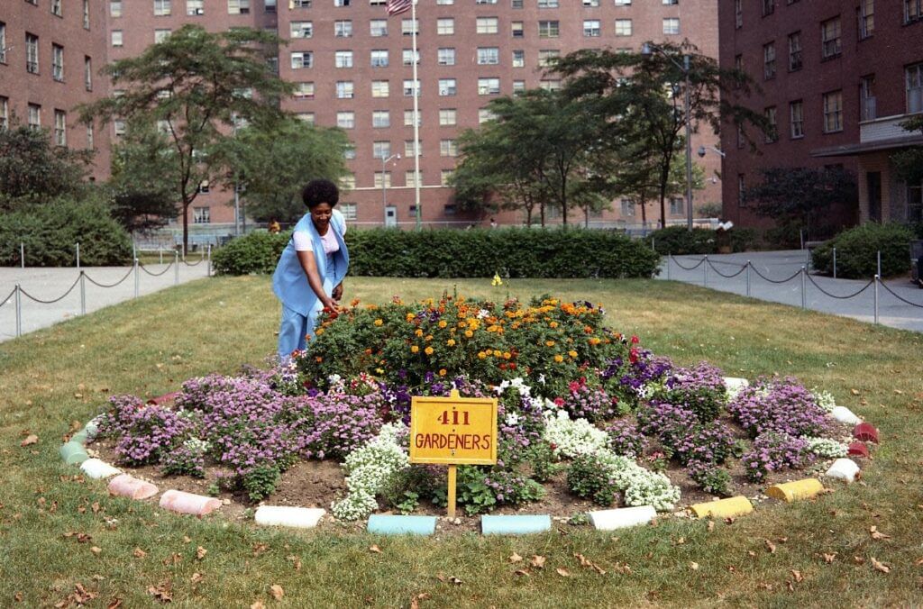 The flower bed at Lafayette Gardens, designed and tended by the 411 Gardeners for the annual NYCHA competition for best flower garden, 1972. Courtesy of the LaGuardia & Wagner Archives.