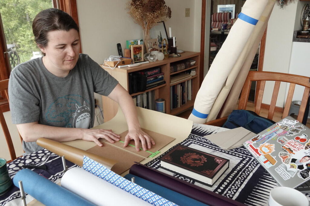 She starts with a quality paperback, usually from a library sale or Goodwill, then measures it and follows a formula to size the book boards correctly. When she began, she cut the boards with a box cutter. She has since graduated to a Cricut, designed for bookbinders.