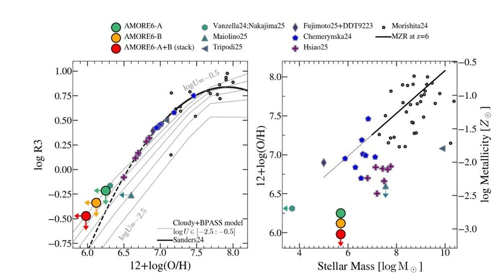 The left panel shows the weak OIII emissions for AMORE6. Since it’s observed through a gravitational lens, there are data points for AMORE6 A, AMORE6 B, and AMORE A & B stacked. The x-axis shows a common way of measuring a galaxy’s metallicity by comparing Oxygen with Hydrogen, since Oxygen is the most abundant metal produced by stars. (12+ log (O/H)) The graph also shows other galaxies from the same age range. It’s complicated, but it shows that AMORE6 is more pristine and has very low metallicity compared to the others. Image Credit: Morishita et al. 2025. Nature