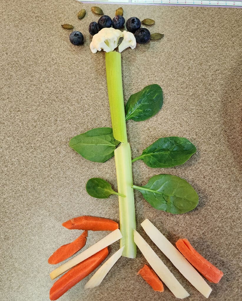 One favorite activity among the students was when Elli Nyberg brought in a plate of vegetables and fruits and guided the class in building a flower. This hands-on activity helped kids visualize how the parts of the plant we eat grow. For example, they used carrots to represent the roots because carrots are root vegetables that grow underground. They used celery to represent the stems because we eat the stalk of the plant.