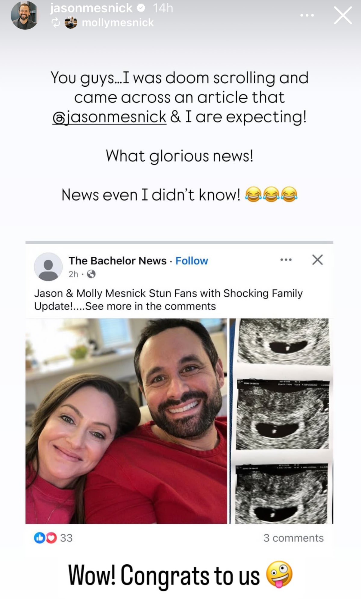 The article also shared an edited photo of Jason and Molly posing together alongside a photo of a sonogram. Molly wrote over the screenshot, “You guys…I was doom scrolling and came across an article that [Jason] & I are expecting!”