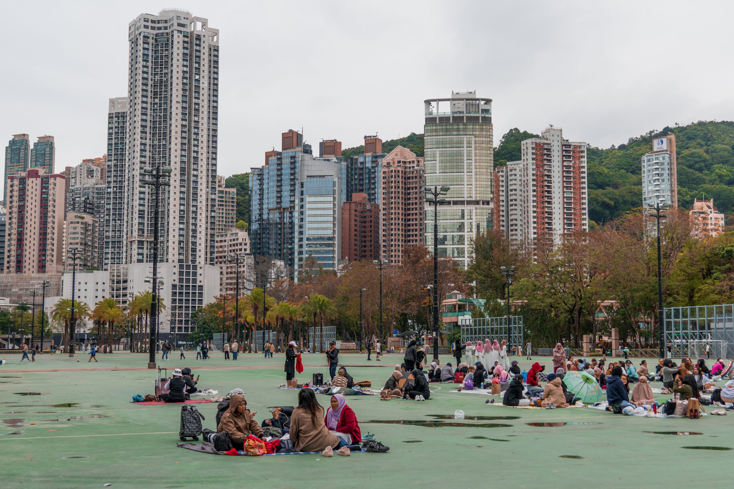 Each Sunday, tens of thousands of people, many of whom are migrant workers, gather on mats in the shadow of the city’s looming skyscrapers, as seen here at Victoria Park March 30, 2025.