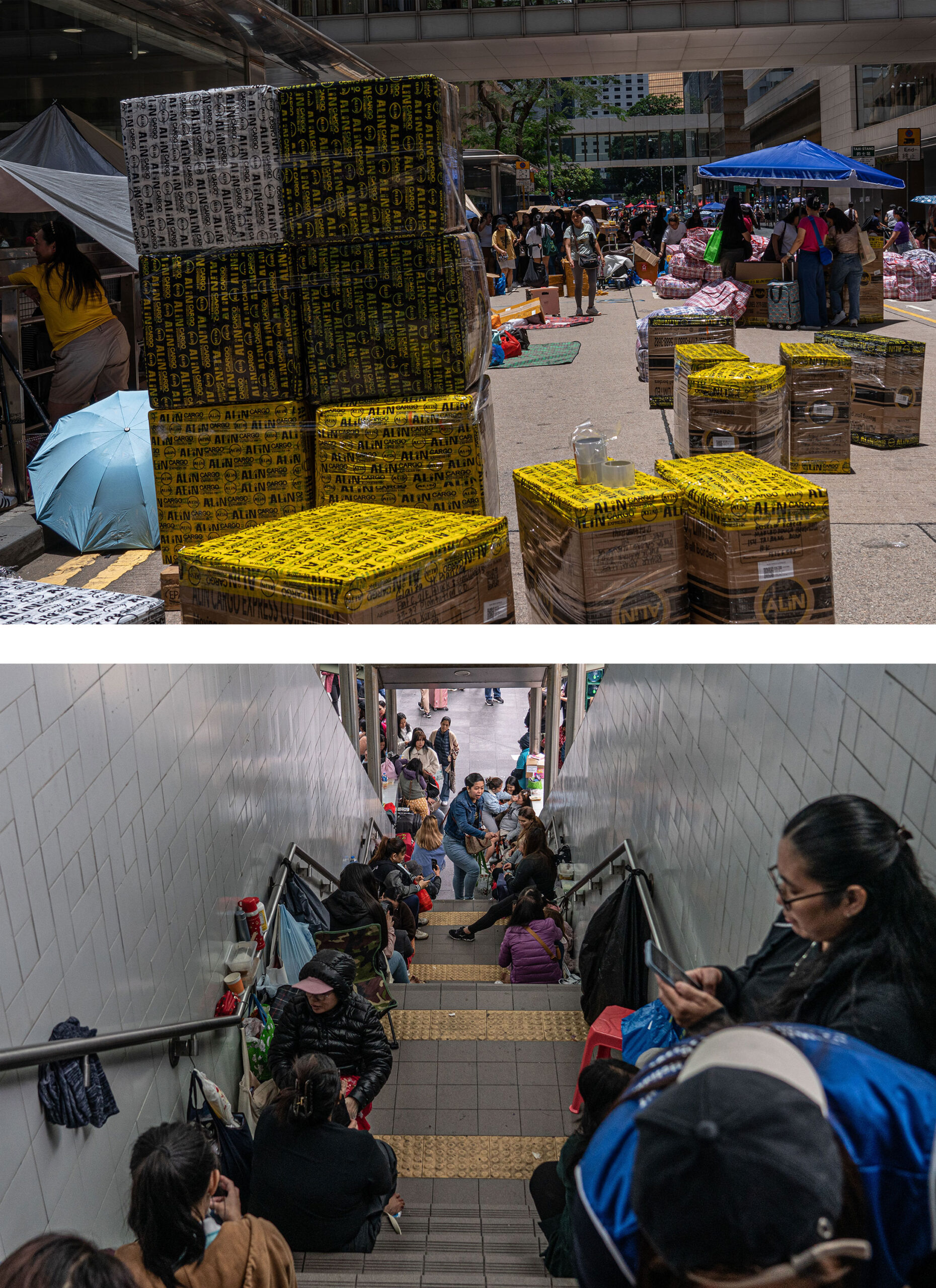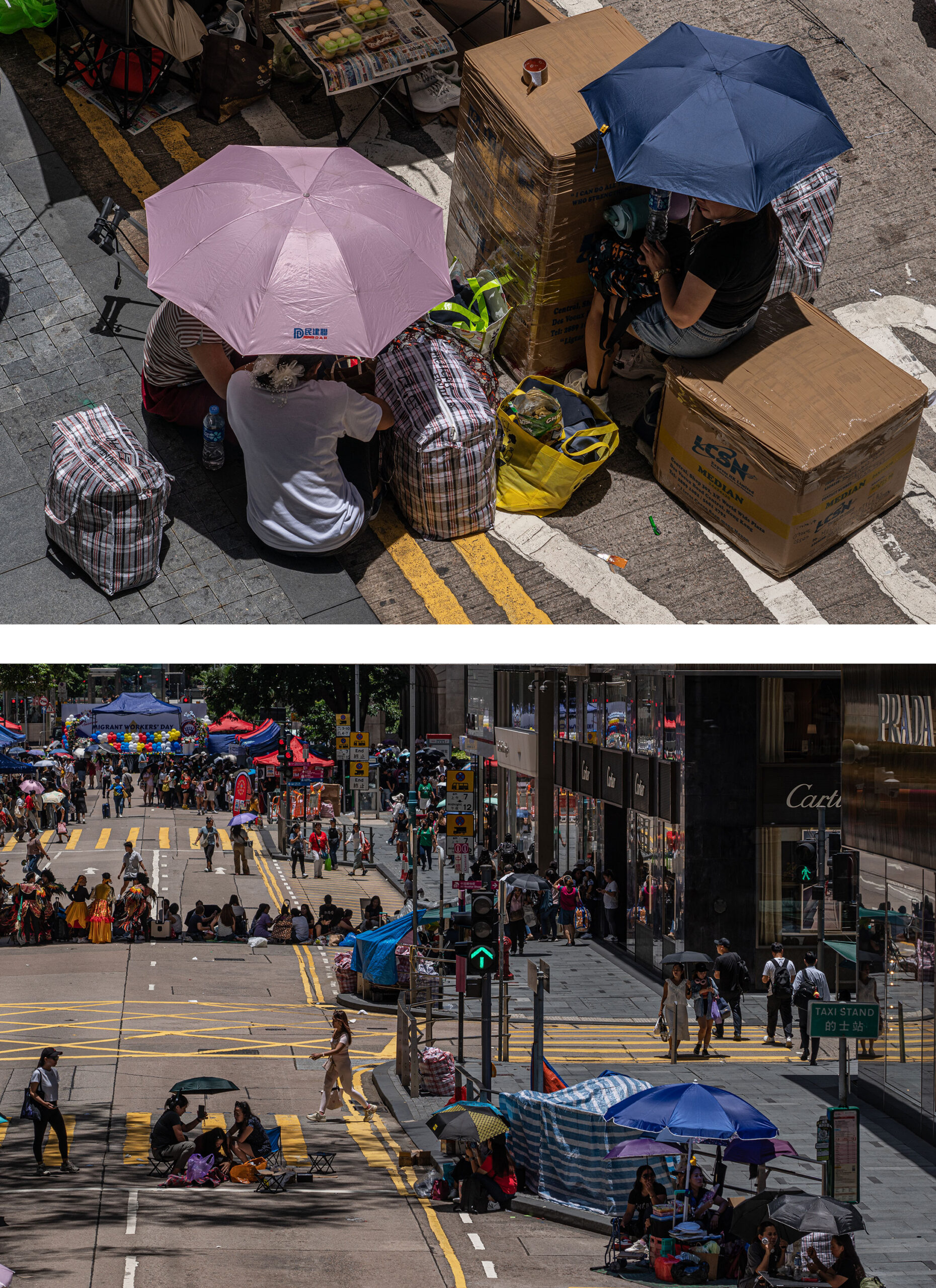 Hong Kong, a city of 7.5 million, has one of the highest ratios of foreign domestic workers in the world, numbering more than 368,000 last year. Here, they congregate on cardboard boxes on a Sunday in March.