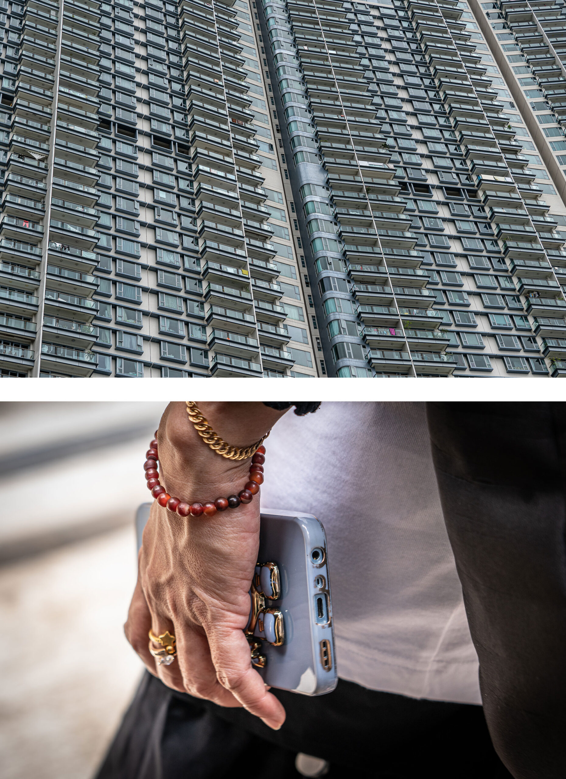 First: Hong Kong’s domestic workers are required to live with their employer, in a city known for its small apartments, as pictured on June 4, 2025. Second: A migrant worker clutches her phone while crossing an intersection on June 22, 2025. These workers are often targeted by online scammers and loan sharks.