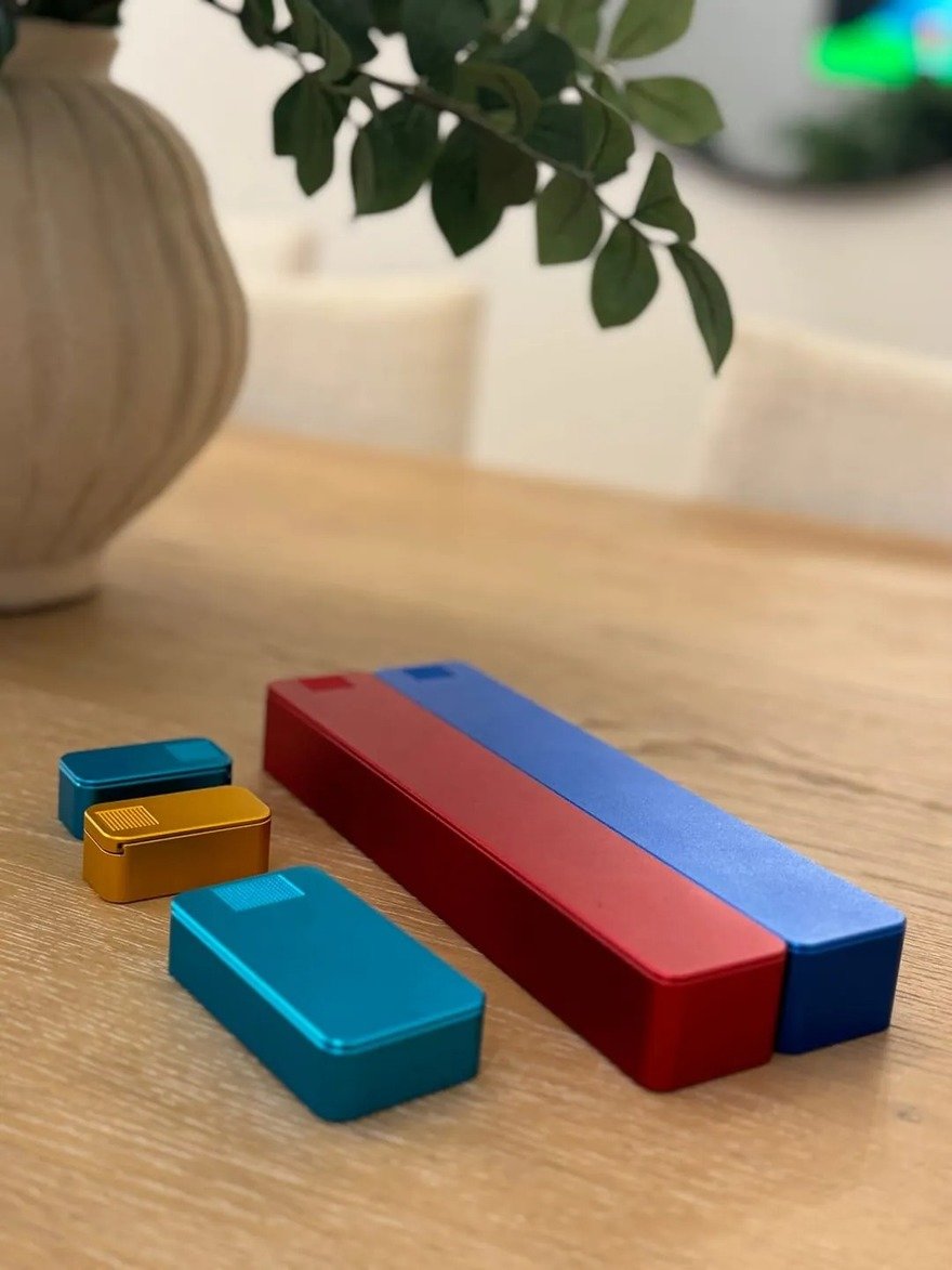 The company produces sturdy, minimalist, anodized aluminum cases with a spring-loaded ball mechanism that keeps the lid securely closed; pressing down on the textured part of the lid allows you to slide it open. Furthermore, hidden detents make it so the lid clicks open at each pocket. ” This makes it super easy to dump single pockets out while holding the case with just one hand,” they explain.