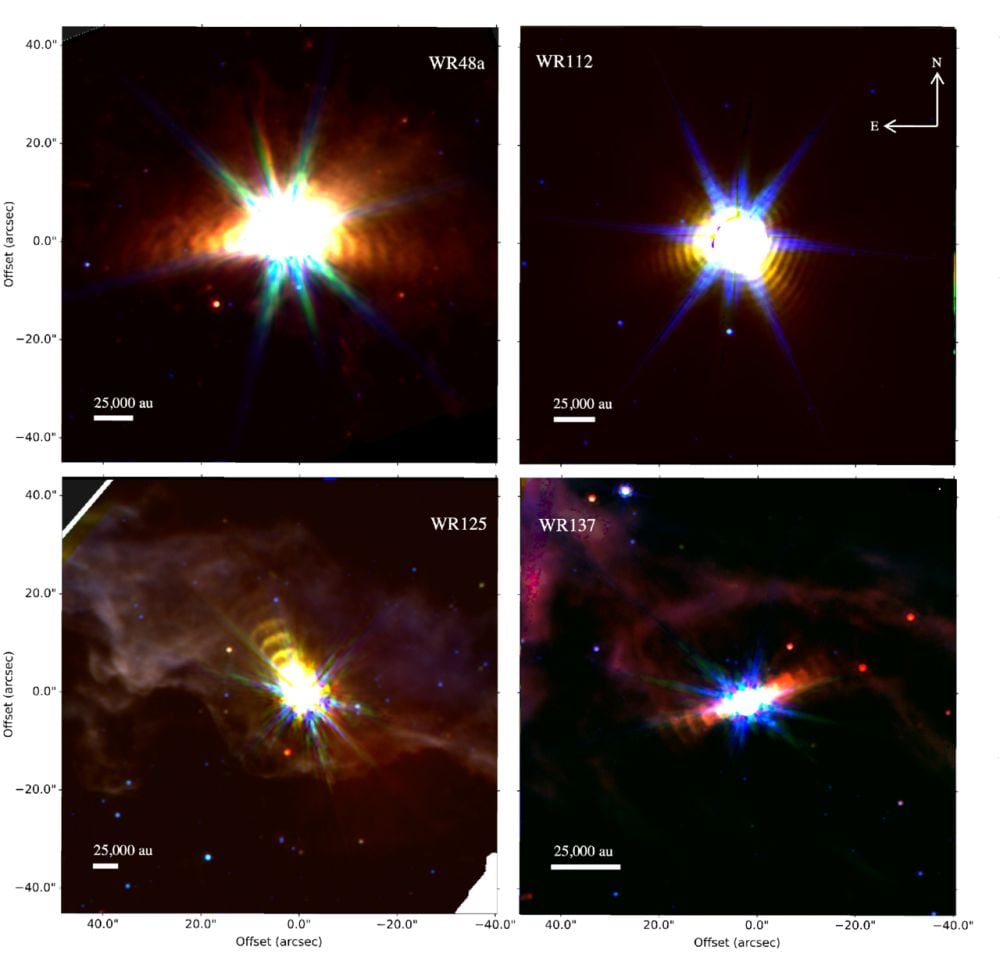 The four Wolf-Rayet stars in the sample. “In all cases, we see large, extended structures around the stars that can be described as repeated dust structures that are similar to those observed with JWST around WR 140,” the authors write. Image Credit: Richardson et al. 2025. ApJ