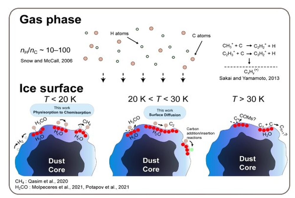 This figure from separate research published in 2023 shows how complex organic molecules (COMs) are believed to be produced on the surfaces of icy carbon dust grains at low temperatures. Image Credit: Tsuge et al. 2023. NatAstr