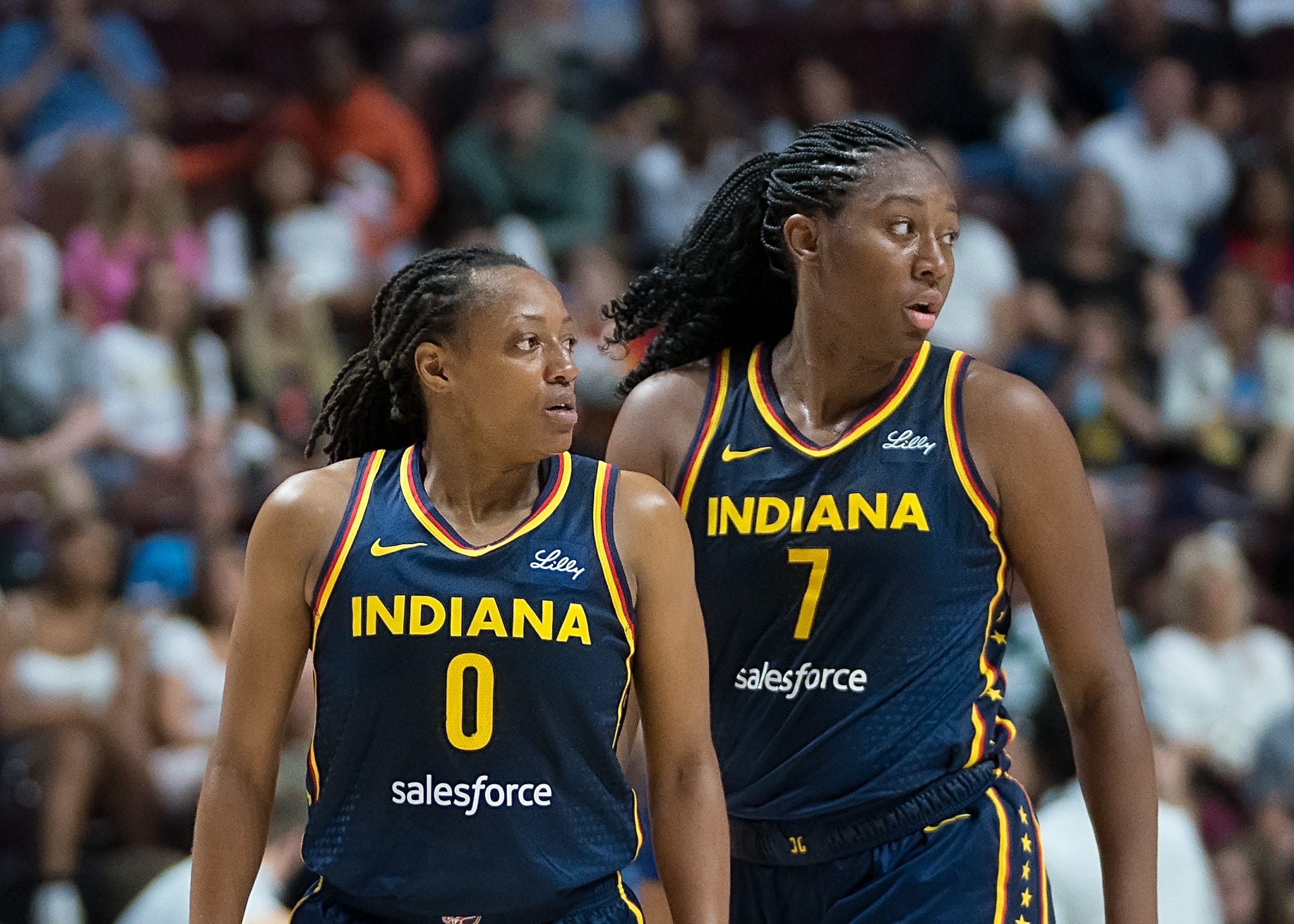 Indiana Fever players Kelsey Mitchell (0) and Aliyah Boston (7). Photo credit: Chris Poss