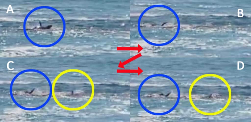Visual proof of the involvement of several sharks in the predation. Photo-sequences (extracted from video) showing dorsal fin and tail, revealing the involvement of a shark predating the victim (blue/dark circles in A and B) followed by the implication of a second one (yellow/clear circles in C and D). Credit: Ethology.
