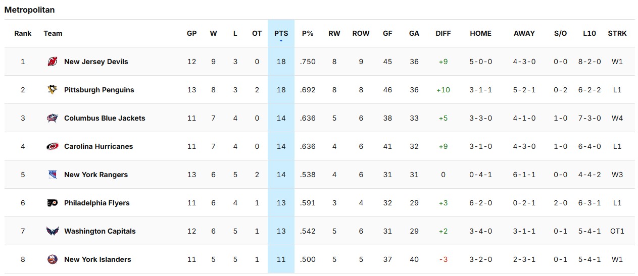 Pittsburgh has cleared the first unofficial and informal hurdle of the “November 1st” rule, as made popular by Elliotte Friedman. The rule says that any team that is 4+ points behind the playoff line at the start of November 1st rarely are able to overcome the deficit. Then again, as of today on November 2nd, every team in the East is within four points of the current final Wild Card spot — which might speak to just how close and competitive the conference is this year. Over in the Western Conference three teams are in the danger zone for this metric — San Jose, Calgary and St. Louis are all four points or more back from the playoff line today.