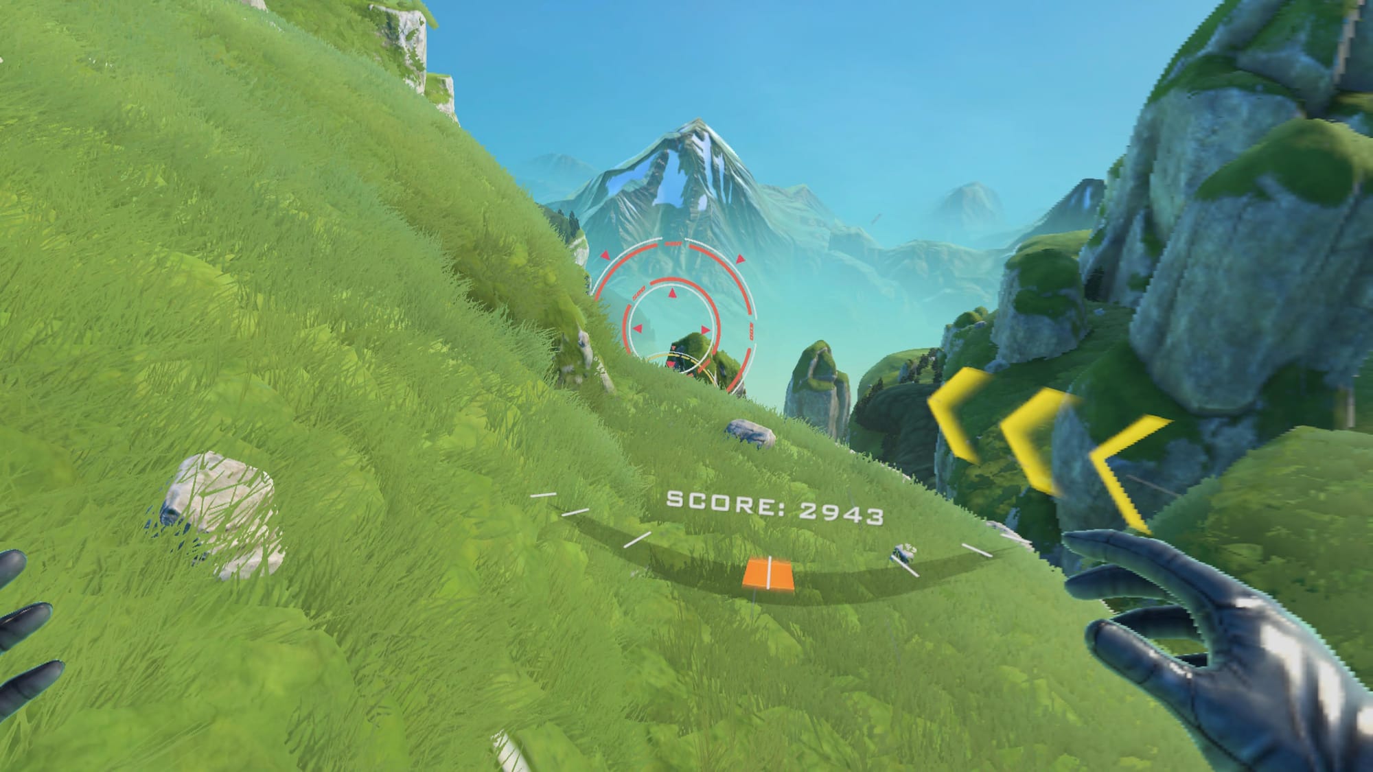 Gliding through and steering involve lifting your arms up to different positions. Raise both at once to ascend, down to descend, or alternate your hand movements here for going left and right. A functional but basic approach that leaves you holding your arms out, though it’s a better choice than using analog sticks. For greater immersion, putting a fan on feels great as the cold “wind” hits you while racing.