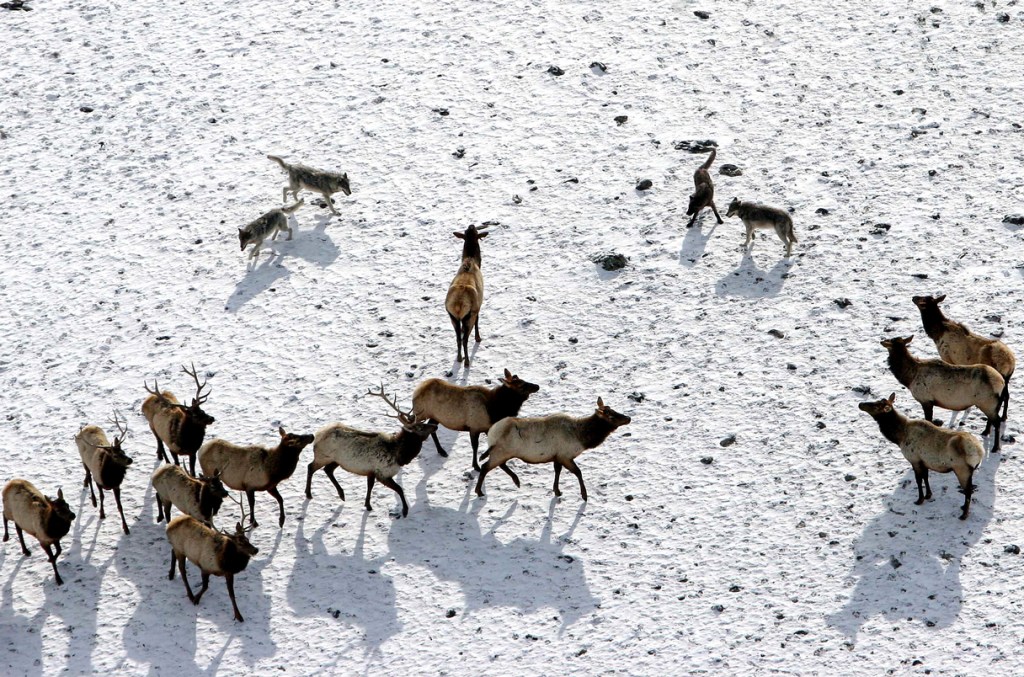 Wolves push an elk herd in Yellowstone. Biologists say wolf packs have contributed to the decline in Yellowstone elk numbers over the last 30 years since they were reintroduced to the park, but many also say that the elk population before wolves returned was greater than the area’s carrying capacity. Credit: Matt Metz / NPS