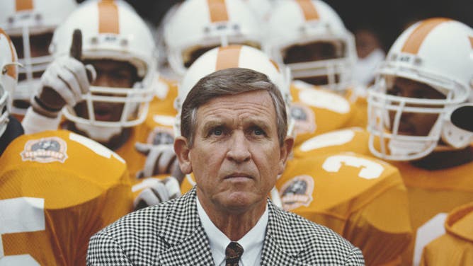 Johnny Majors, Head Coach for the University of Tennessee Volunteers stands with his team during the NCAA Southeastern Conference college football game against the University of Notre Dame Fighting Irish on November 10, 1990 at the Neyland Stadium in Knoxville, Tennessee. (Photo by Rick Stewart/Allsport/Getty Images)